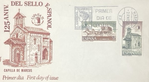 Sobre de Primer Día – 125 Aniversario del sello español con dos valores de la serie de 3 y 10 pesetas. Capilla de Marcus con matasellado de Madrid