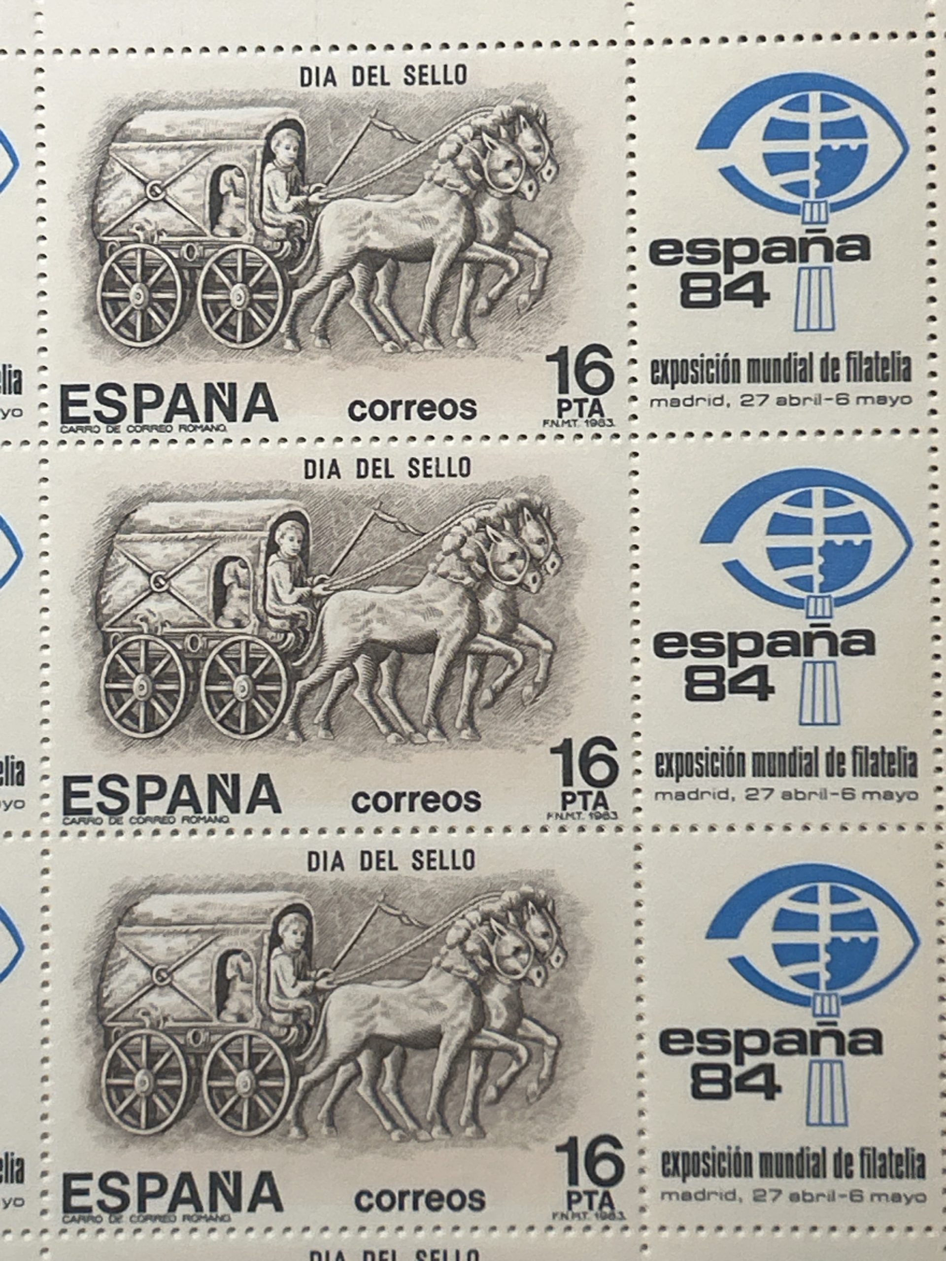 Motivo: Carro romano antiguo utilizado por los servicios de Correos, inspirado en un bajo relieve en piedra. Viñeta con el logotipo de la Exposición Mundial de Filatelia ESPAÑA´84.