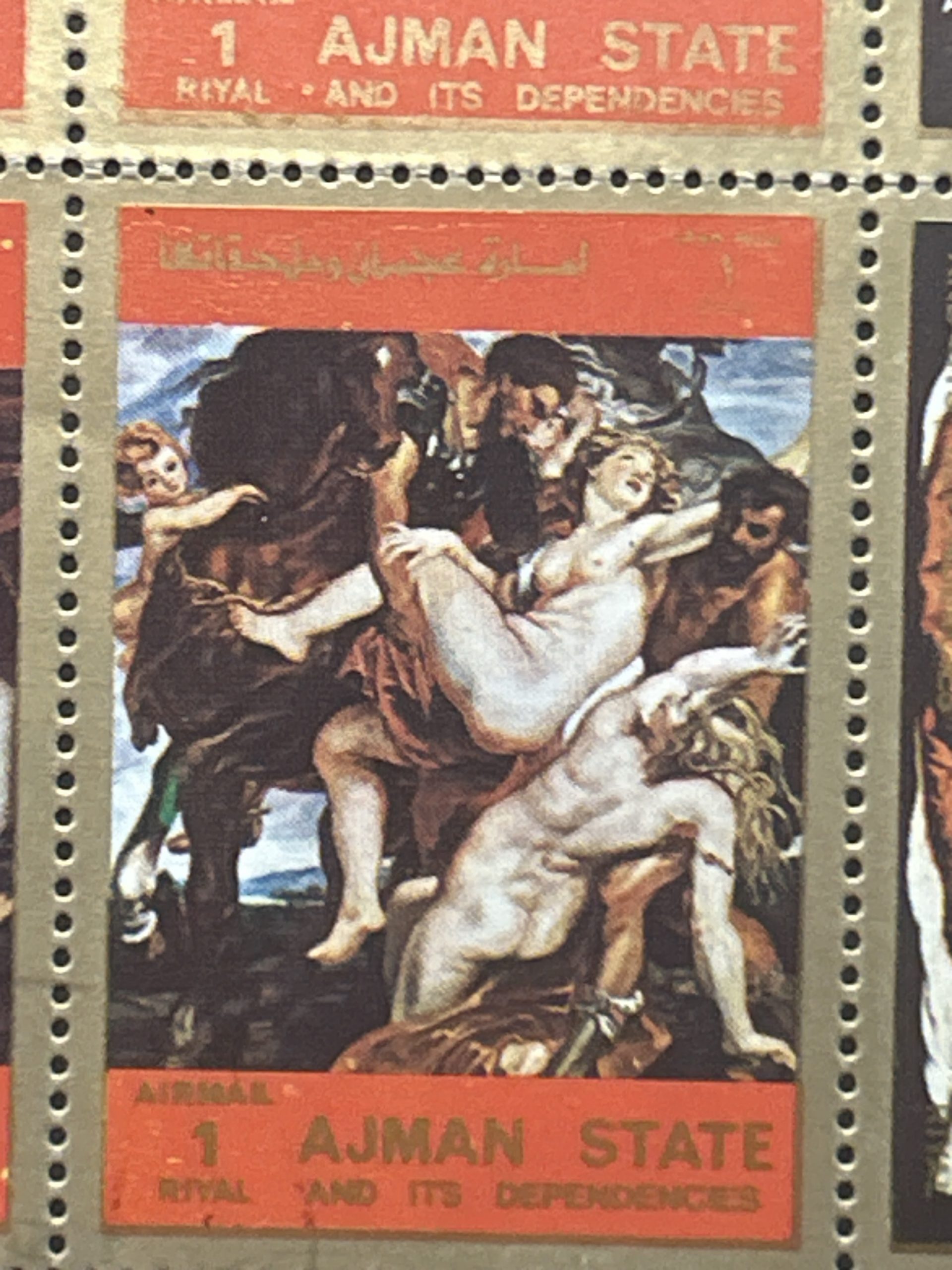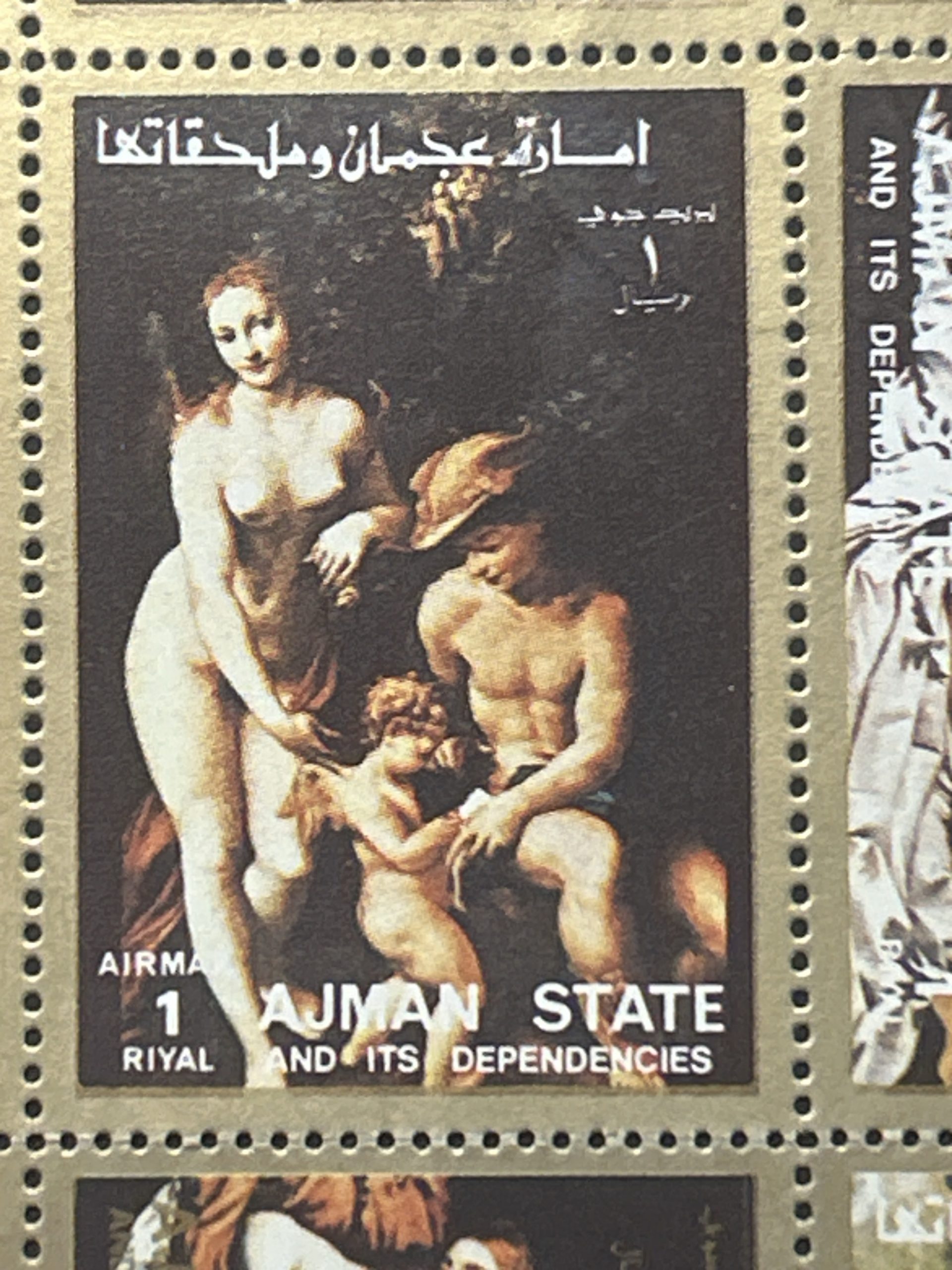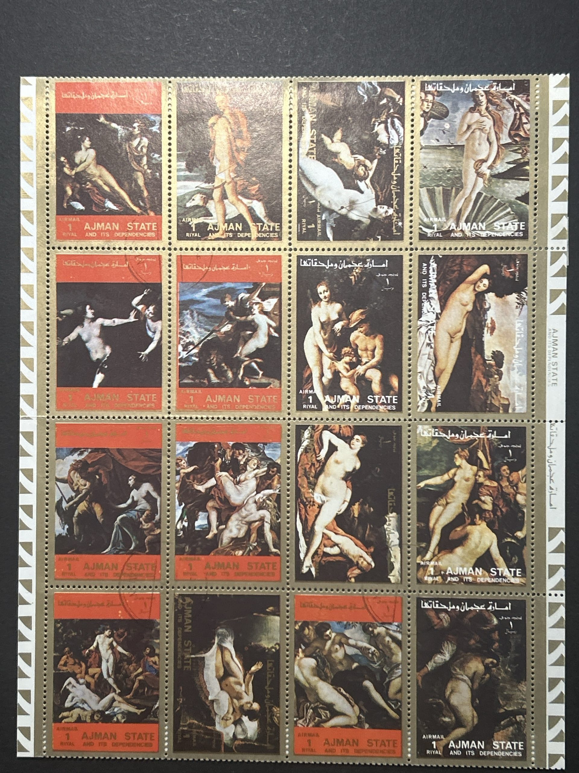 Pliego de escenas de desnudos en diversas obras de arte, emitido por Ajman State en 1972