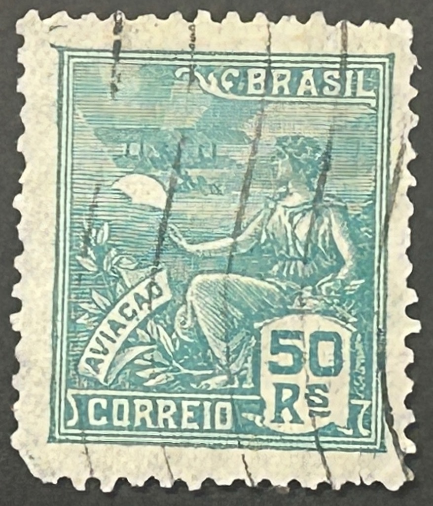 Sello Brasil 1931 – Aviación- 50 Rs , Azul Verdoso, Usado