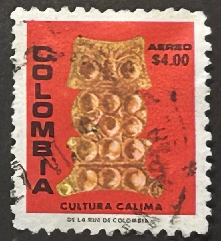 The stamps shows a golden artifact of the Calima cultute (200 BCE–400 CE) a series of pre-Columbian cultures from the Valle del Cauca department in Colombia.