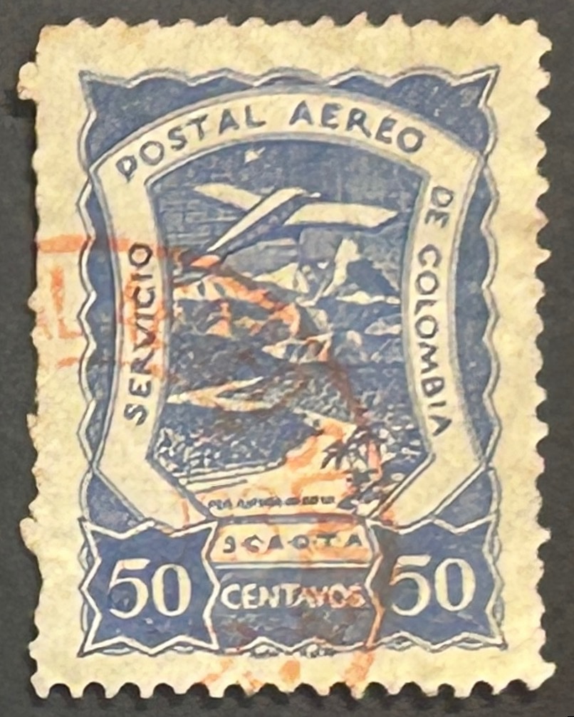 Sello Colombia 1921 – SCADTA – 50 céntimos , Azul – Usado, Aéreo