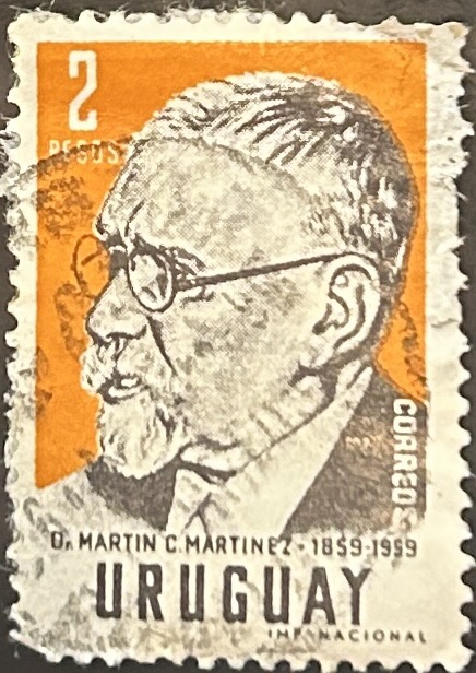 Sello Uruguay 1960 – Martín Martínez – 2 Céntimos Naranja y negro – Usado Deteriorado