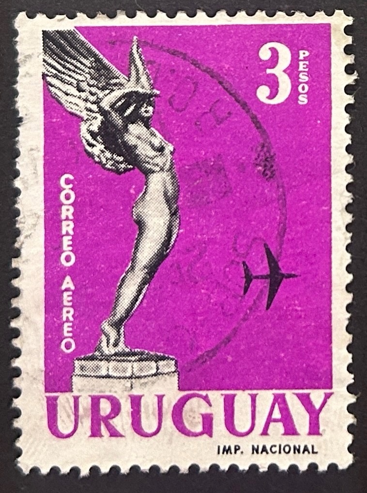 Sello Uruguay 1960 – Diosa Alada – 3 Pesos Rosa y Negro , usado