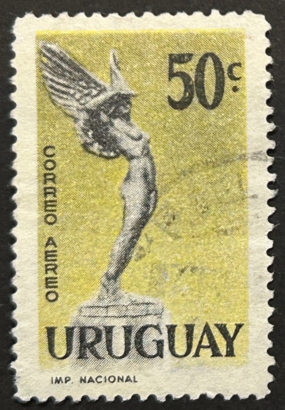 Sello Uruguay 1959 – Diosa Alada – 50c negro y amarillo, usado