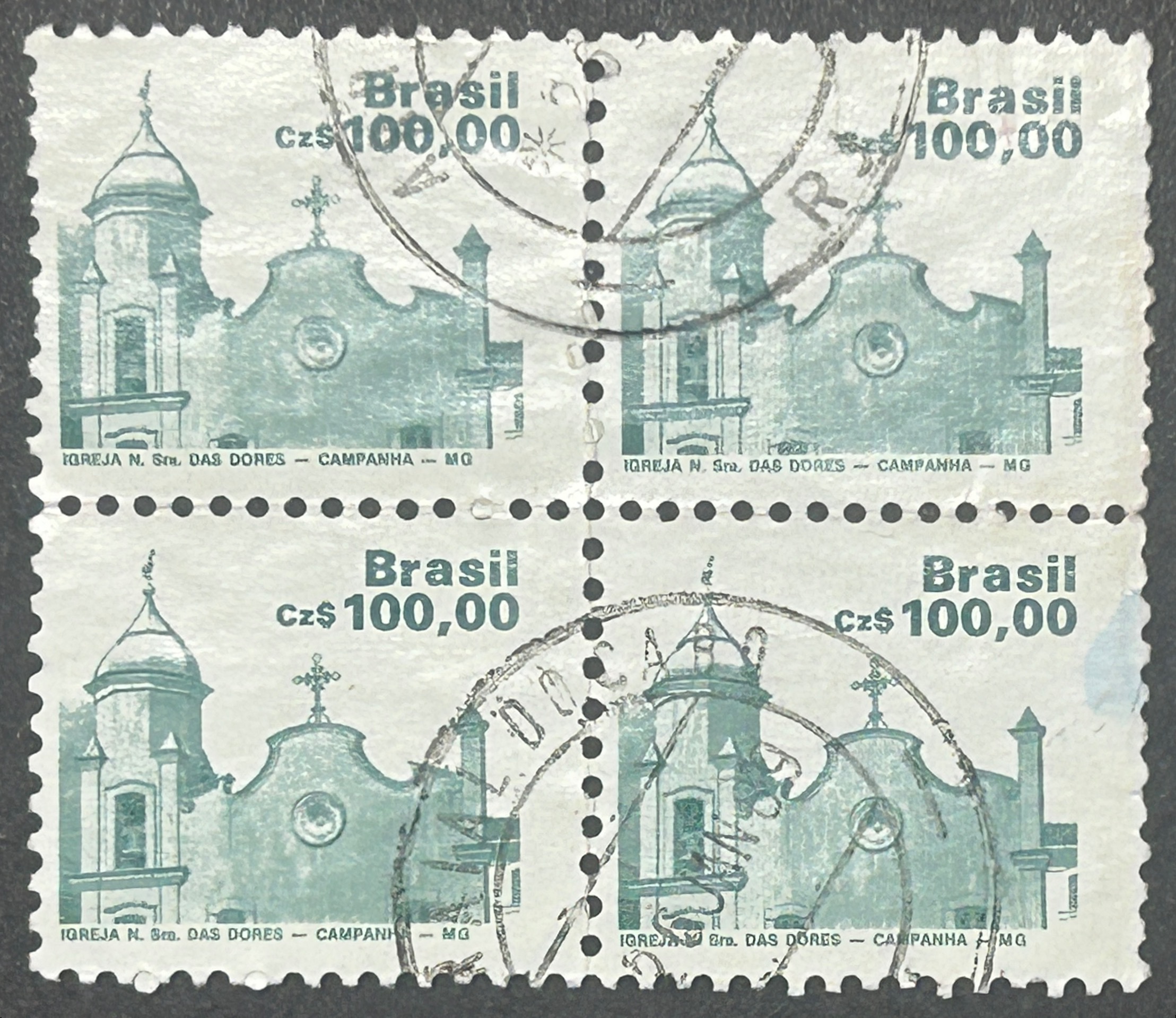 Sellos Brasil 1987 – N.Sra das Dores – 100,00 Cr$ Verde . Usado bloque de 4