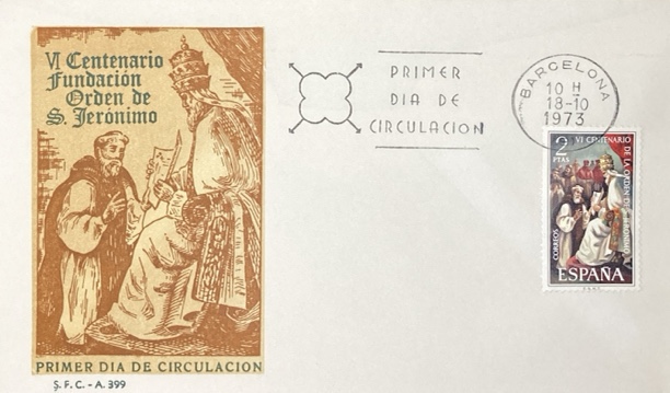 Sobre Primer día – V Centenario de la Fundación de la Orden de San Jeronimo, 1973 con sello de. 2 ptas