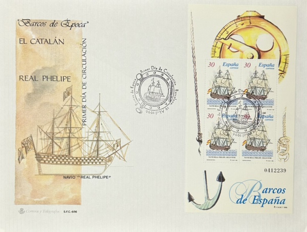 Barcos de época – Navío Real Phelipe Siglo XVIII – Alias El Catalán – 1996 – Gran Tamaño con hoja bloque de 4 valores de Barcos de España
