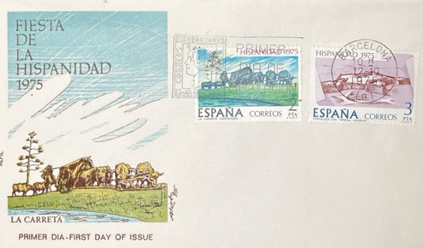 Sobre Primer Día – Fiesta de la hispanidad 1975 – Uruguay – Sellos 2+3 ptas Matasellos de Barcelona y motivo de monumento a la carreta