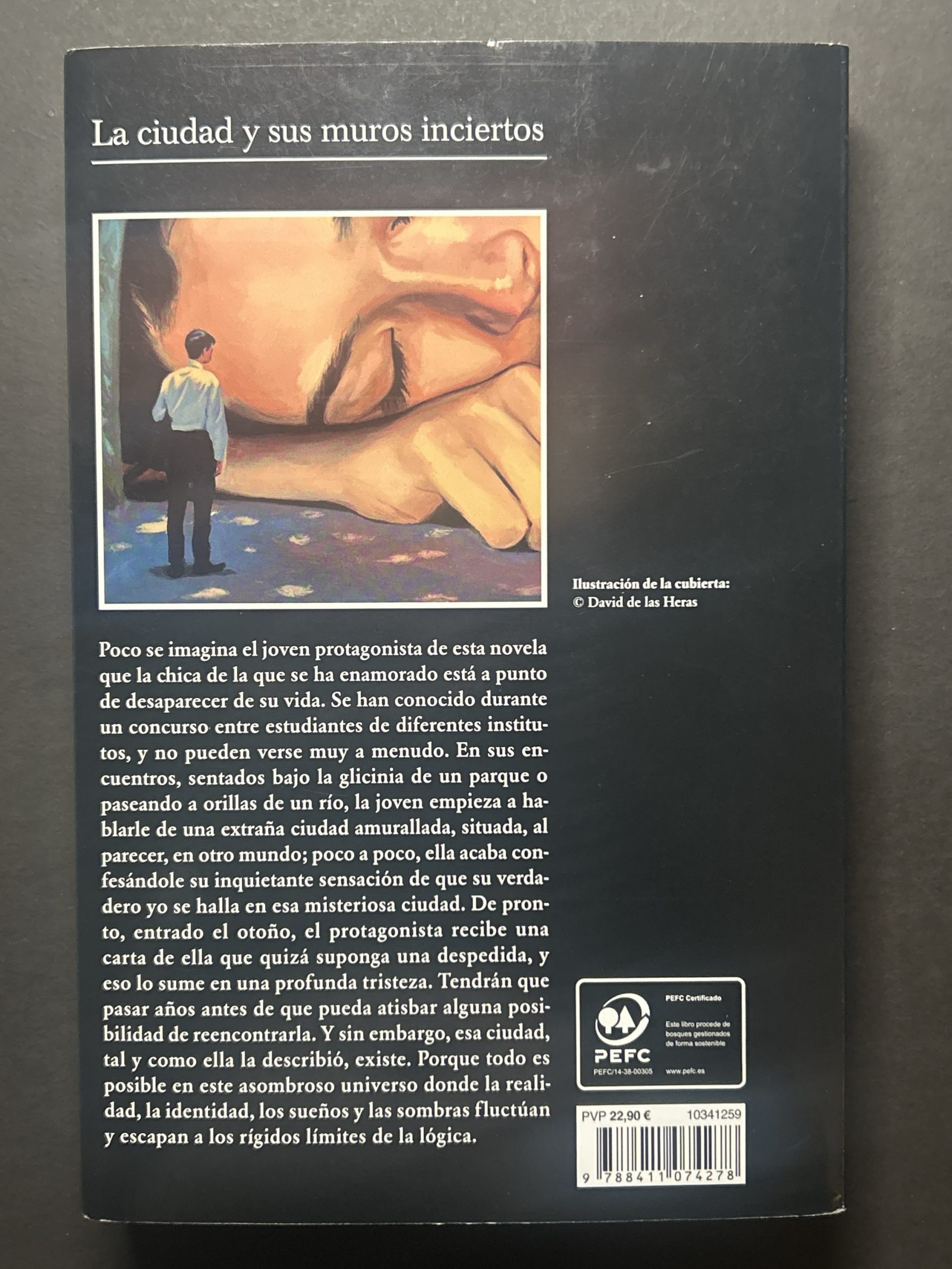 Poco se imagina el joven protagonista de esta novela que la chica de la que se ha enamorado está a punto de desaparecer de su vida. Se han conocido durante un concurso entre estudiantes de diferentes institu-tos, y no pueden verse muy a menudo. En sus en-cuentros, sentados bajo la glicinia de un parque o paseando a orillas de un río, la joven empieza a hablarle de una extraña ciudad amurallada, situada, al parecer, en otro mundo; poco a poco, ella acaba confesándole su inquietante sensación de que su verdadero yo se halla en esa misteriosa ciudad. De pron-to, entrado el otoño, el protagonista recibe una carta de ella que quizá suponga una despedida, y eso lo sume en una profunda tristeza. Tendrán que pasar años antes de que pueda atisbar alguna posibilidad de reencontrarla. Y sin embargo, esa ciudad, tal y como ella la describió, existe. Porque todo es posible en este asombroso universo donde la reali-dad, la identidad, los sueños y las sombras fluctúan y escapan a los rígidos límites de la lógica.
