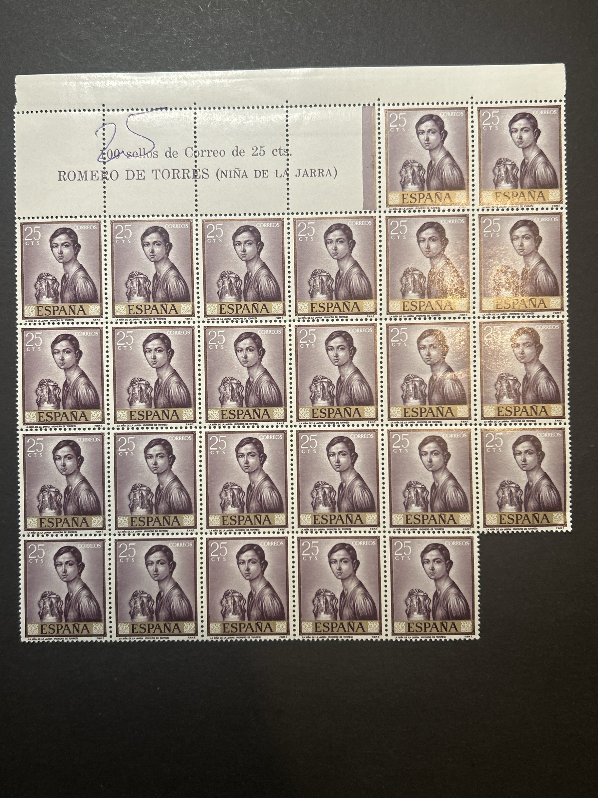 Pliego incompleto de 25 valores de 25 céntimos de la obra Niña de la Jarra de Romero de Torres de 1965