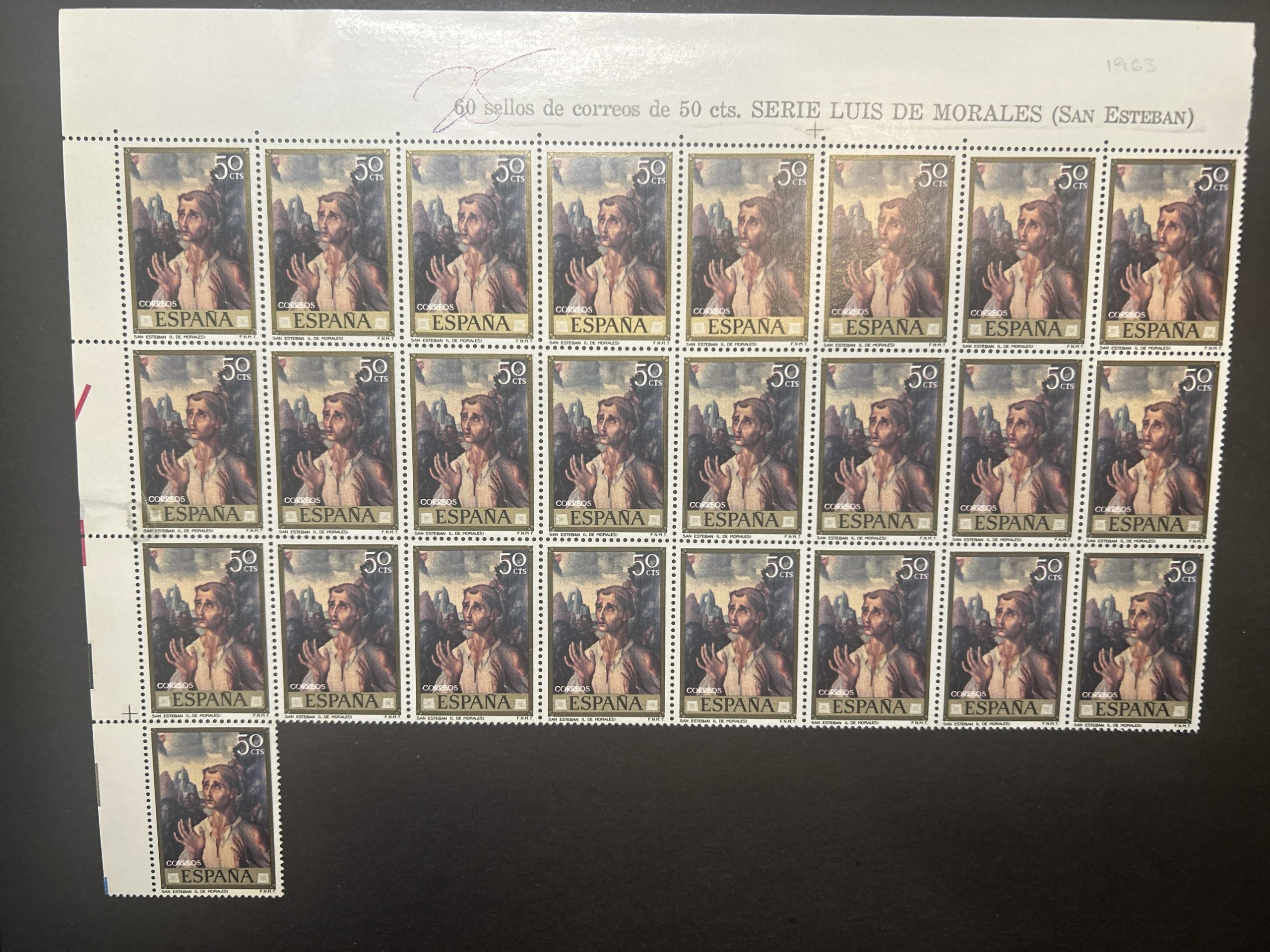 Pliego incompleto de 25 valores de 50 céntimos de “san Esteban” por Luis de Morales , 1970