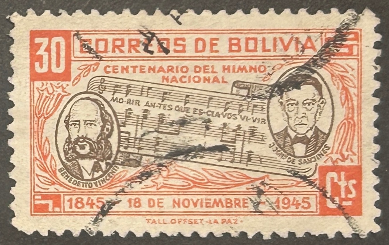 The national anthem of Bolivia, also known as Bolivianos, el Hado Propicio (Bolivians, a most Favorable Destiny) was adopted in 1851. José Ignacio de Sanjinés, a signer of both the Bolivian Declaration of Independence and the first Bolivian Constitution, wrote the lyrics. The music was composed by an Italian, Leopoldo Benedetto Vincenti.Both are shown on stamps.