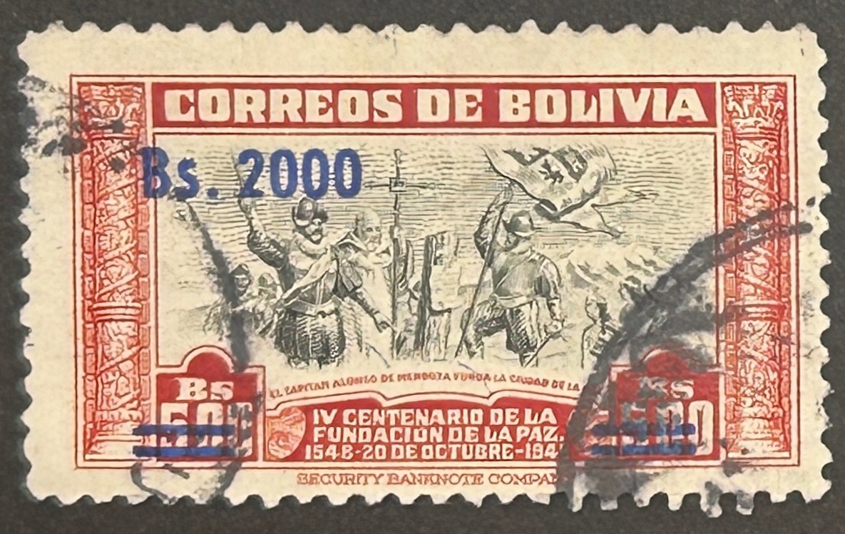 Surcharged in Blue Bs.2000 on Bs.5.00. Previous value overprinted with bars.