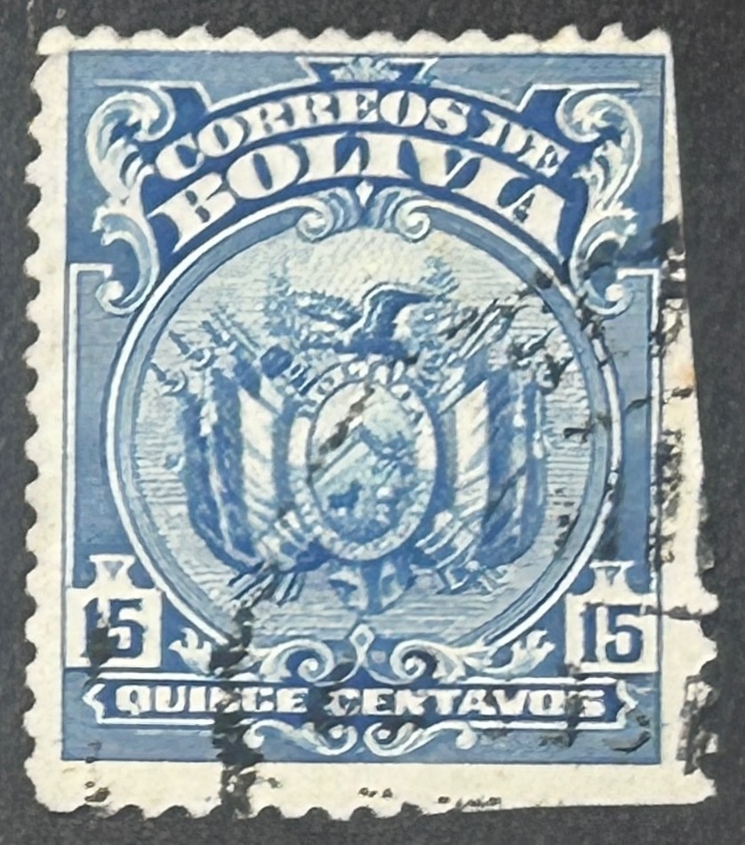 Sello Bolivia 1925 – Escudo – 15 Centavos Azul Usado, Borde cortado