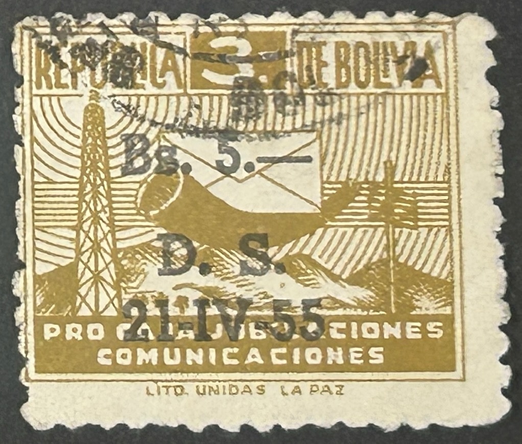 Sello Bolivia 1955 – Pro Caja Jubilaciones – Sobrecargado 5 Bs Marrón Usado