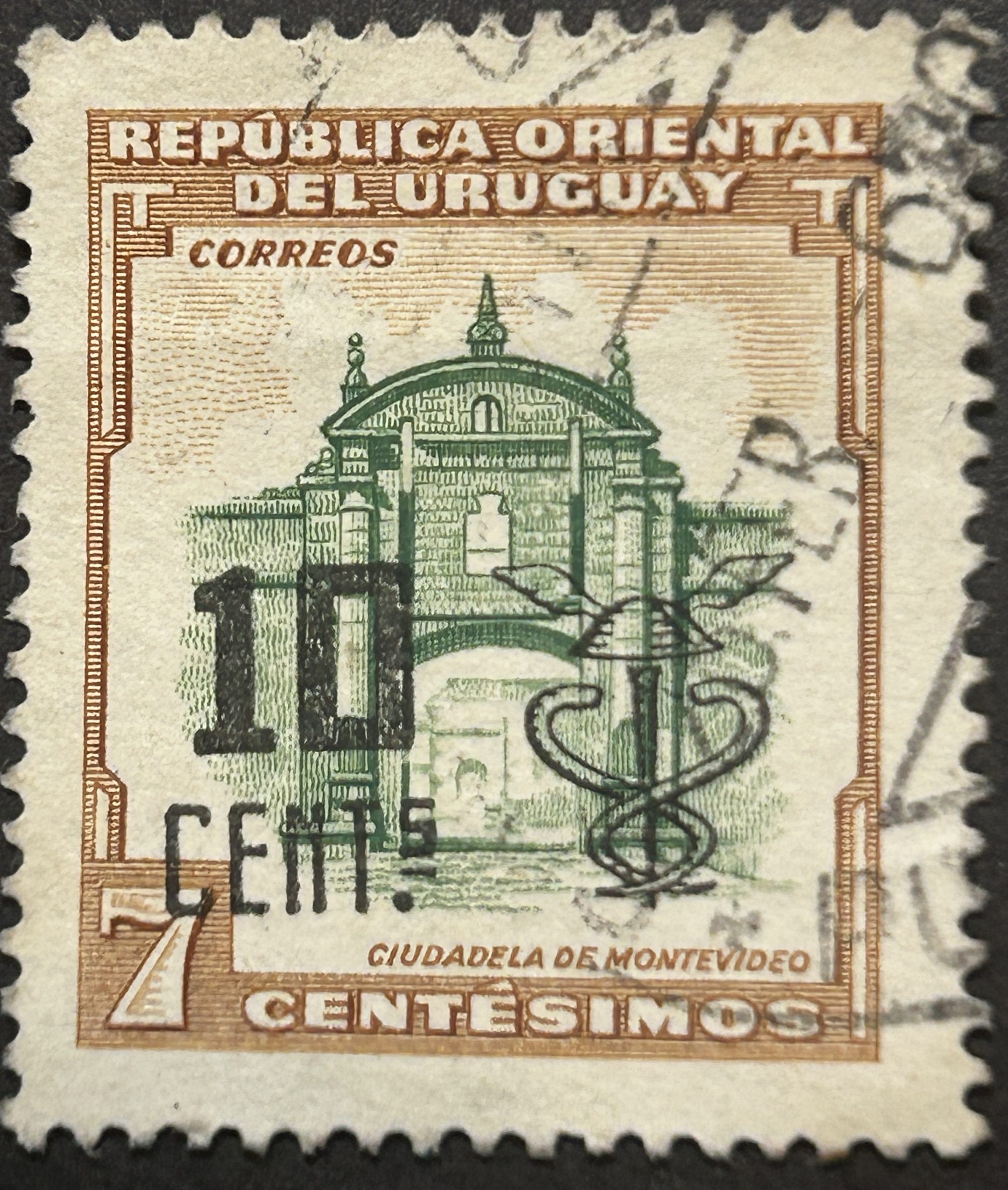 Sello Uruguay 1958- La ciudadela de Montevideo – usado 7c sobrecargado 10c Claro y Verde