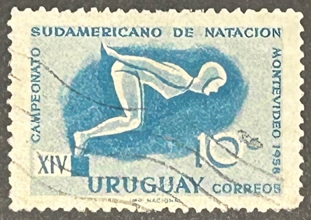 Sello Uruguay 1958 – Campeonato Sudamericano de Natación – 10 c Azul Usado
