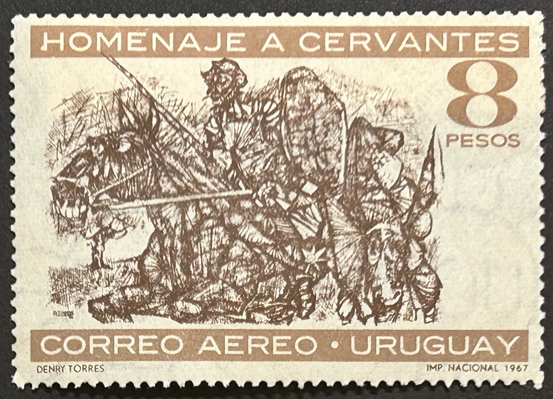 Sello Uruguay 1967 – Homenaje a Cervantes- 8 pesos , marrón , Nuevo