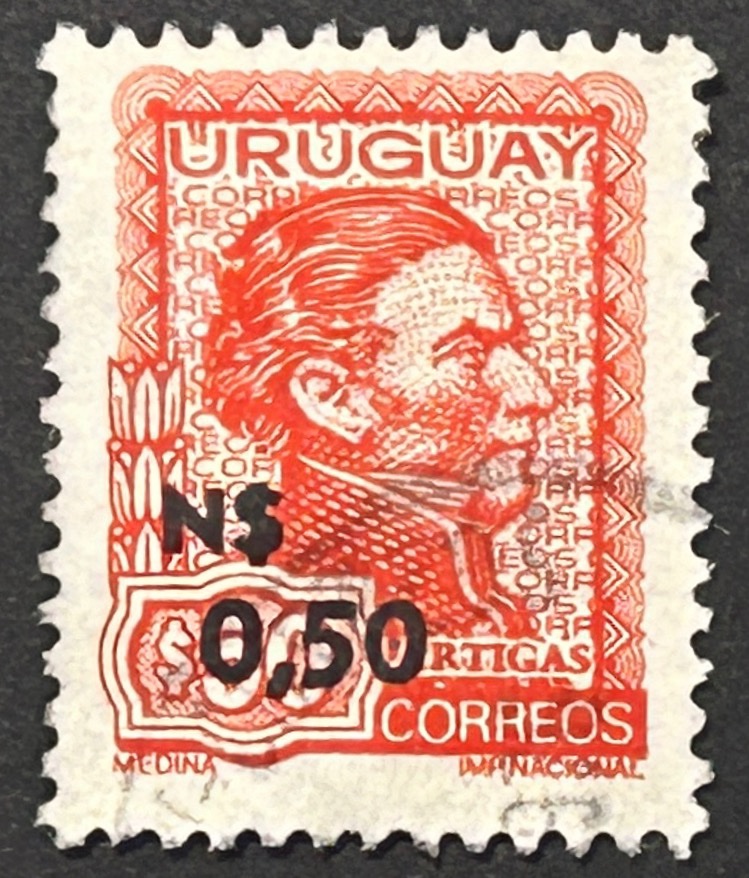 Sello Uruguay 1975 Artigas de Medina – 0,50 Nuevos pesos sobre 50 pesos Rojo, Usado
